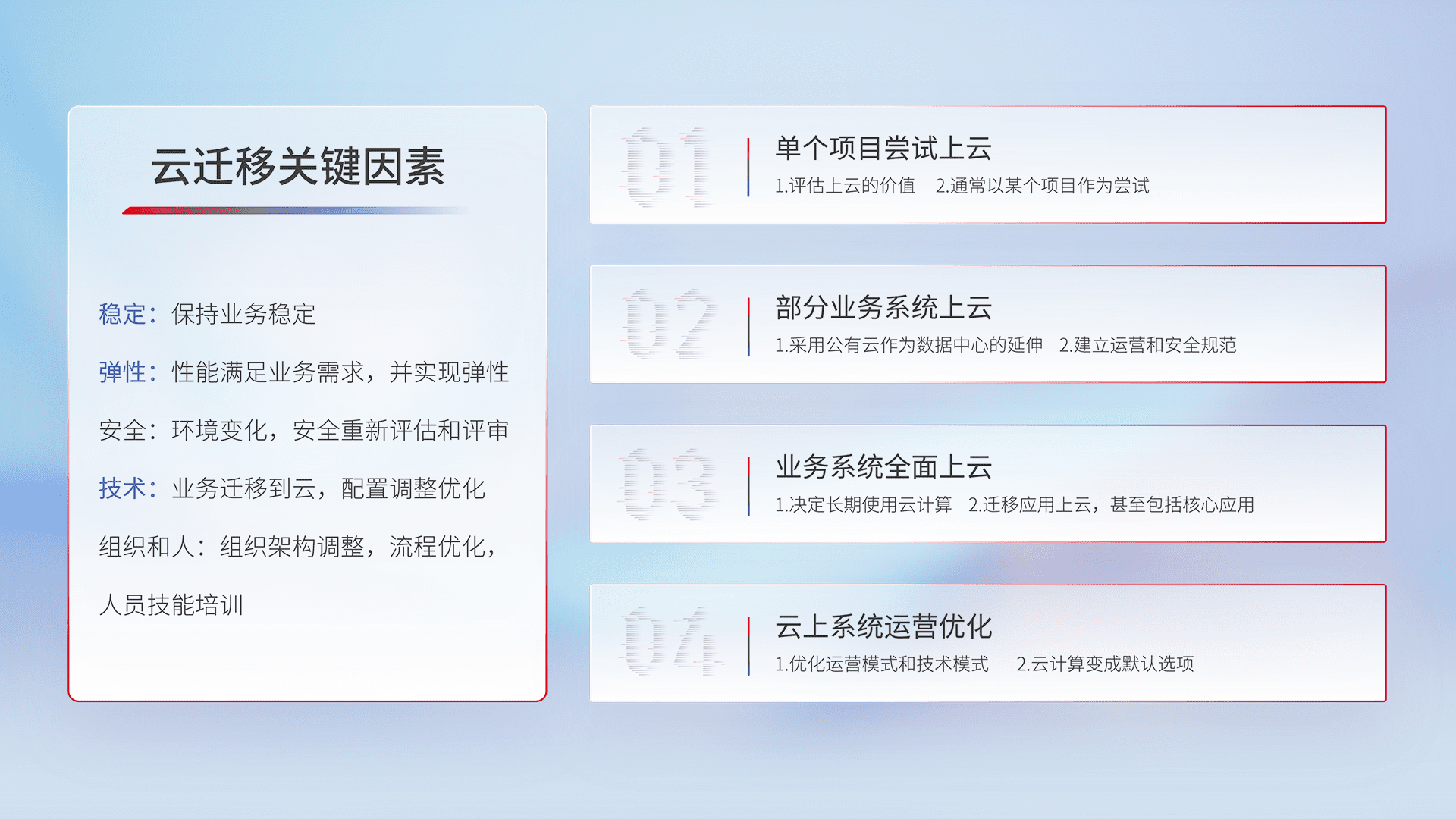结合实际业务,,从规划设计、、、云平台选型、、、云原生改造、、、、数据迁移、、集成交付,,迁移全过程为客户识别最佳上云路径,,,,做好风险识别管理,,,,设计网络架构、、、、身份权限、、安全审计合规、、操作审计、、、日志审计、、、监控告警策略、、、多站点容灾设计等,,,对云上基础设施进行整体规划,,,提升IT治理水平,,,以满足弹性、、、高可用、、、高性能的需求。。。