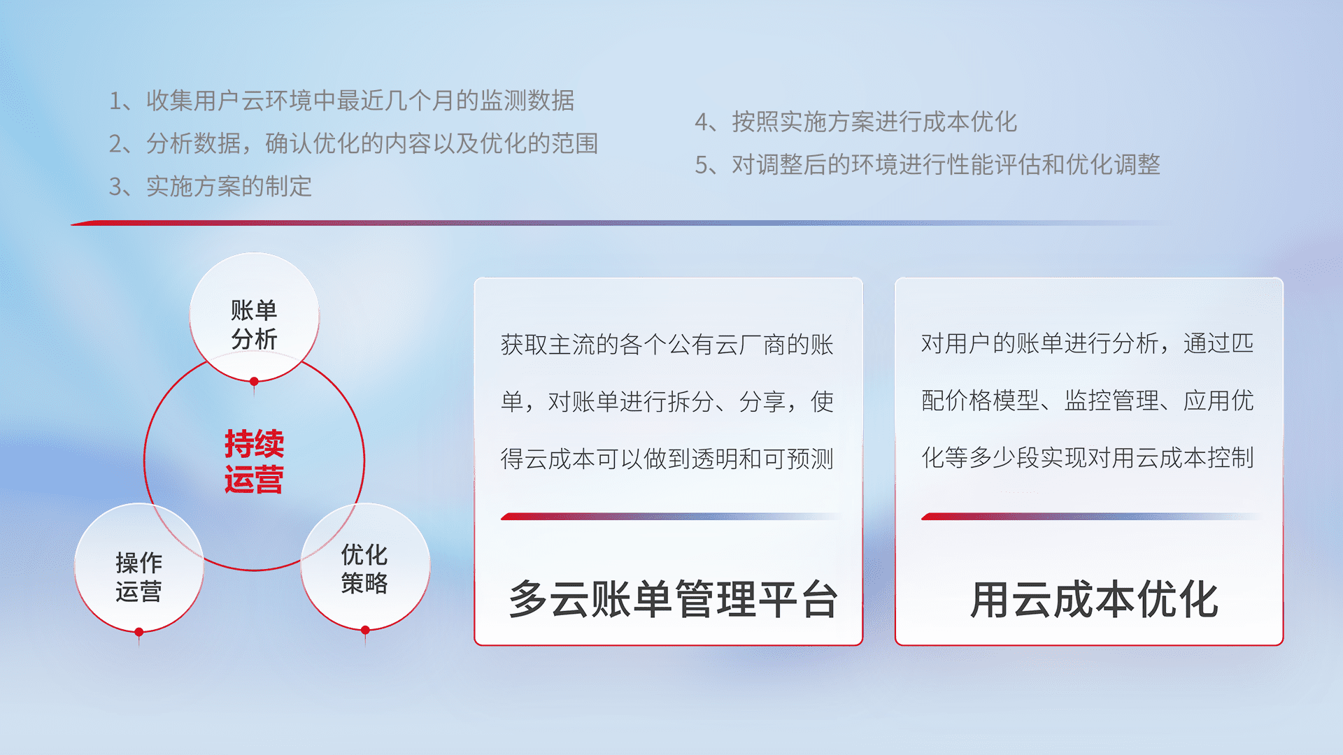 通过多云纳管,,,,以统一的资源数据模型把客户的云资源进行抽象和封装,,,进而实现对多云资源的统一操作,,,,保障云资源管理的可靠性、、、、稳定性与可用性。。。量身定制化运维内容,,,,配置、、、、开发运维、、、、补丁管理、、备份、、监控、、认证和访问管理、、审计和日常巡检等,,保障在用云过程中的可靠度,,,,稳定度以及高可用率。。。。